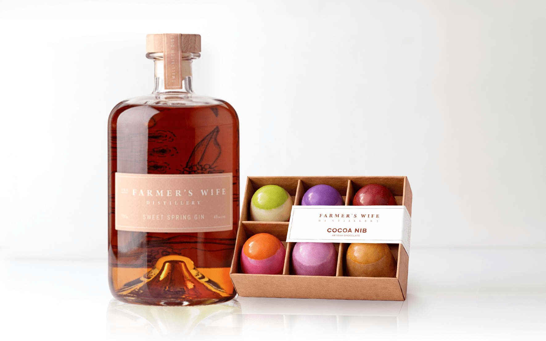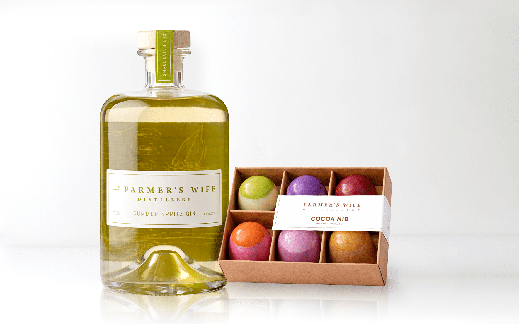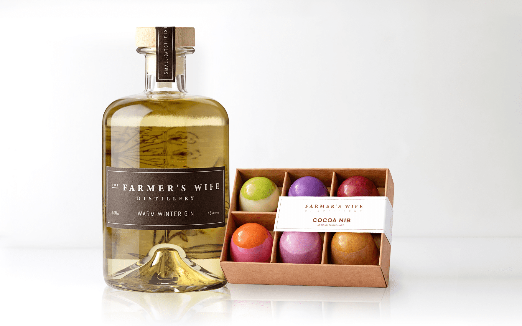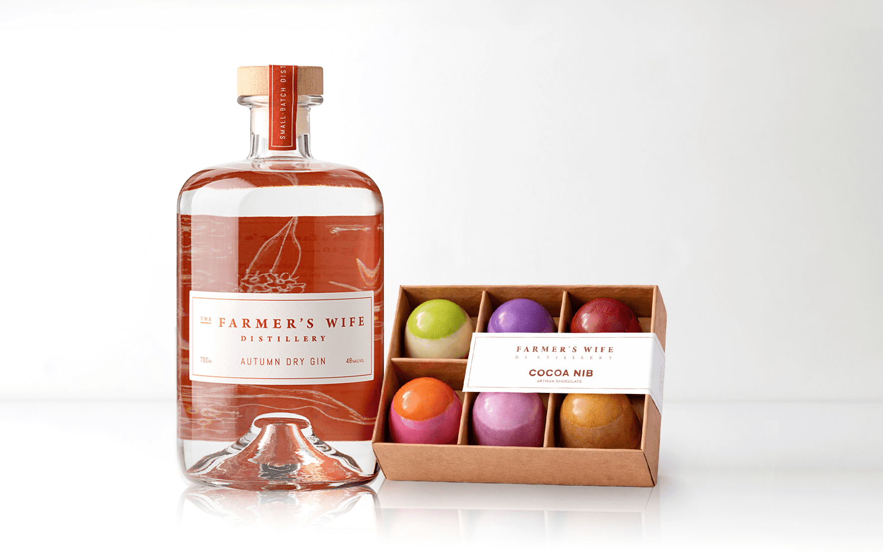 A celebration of craft and indulgence, our Gin & Chocolate Gift Pack brings together the signature spirits of Farmer’s Wife Distillery with the artistry of Cocoa Nib.